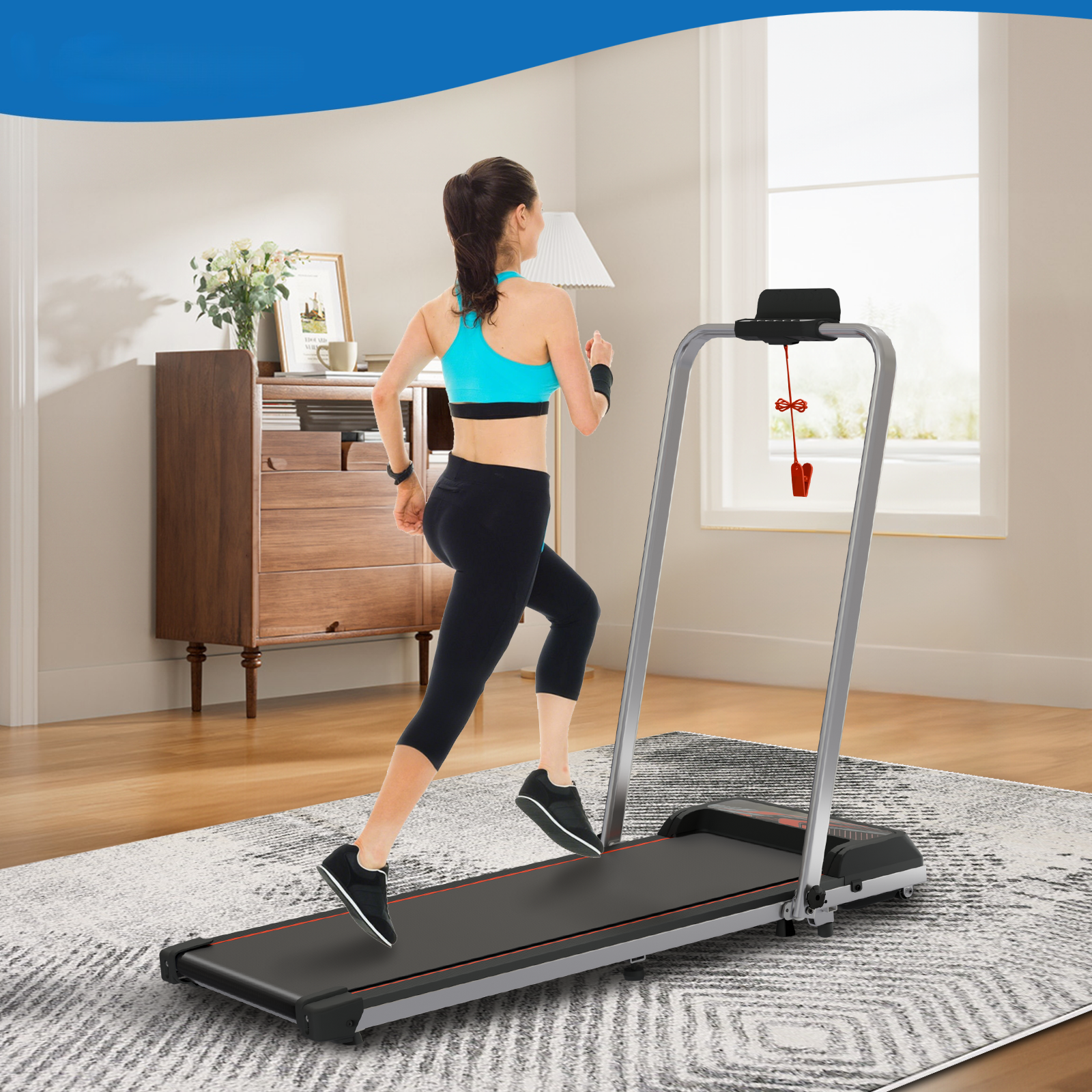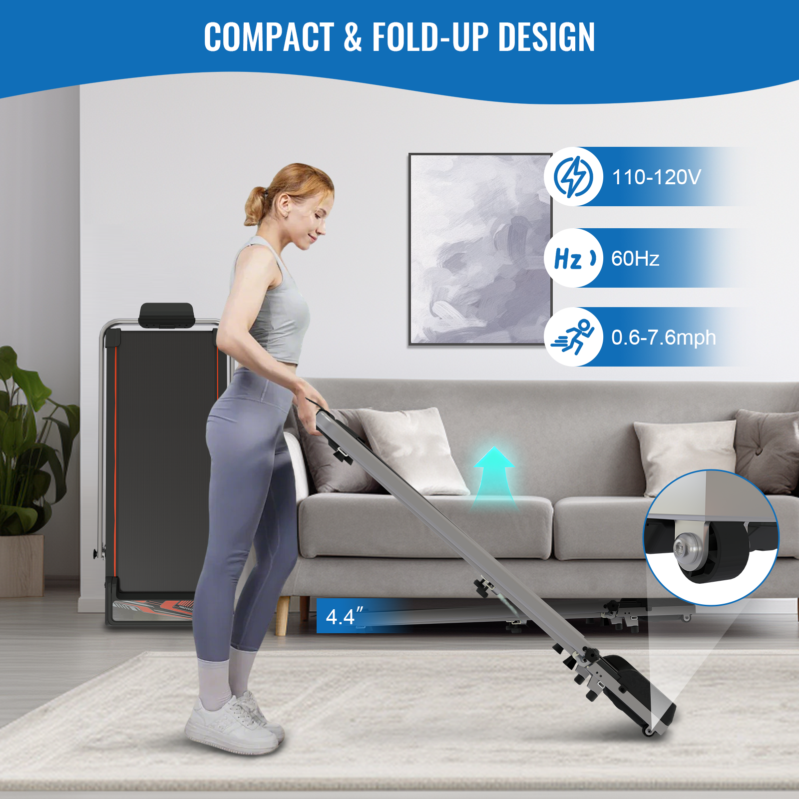 - 【Space Save Design】This small treadmill with transportation wheels, folds only less than 4.5 inches thick after use, you can easily move and store it under the office desk, sofa, corner or bed, largely save your home apartments and office spaces.