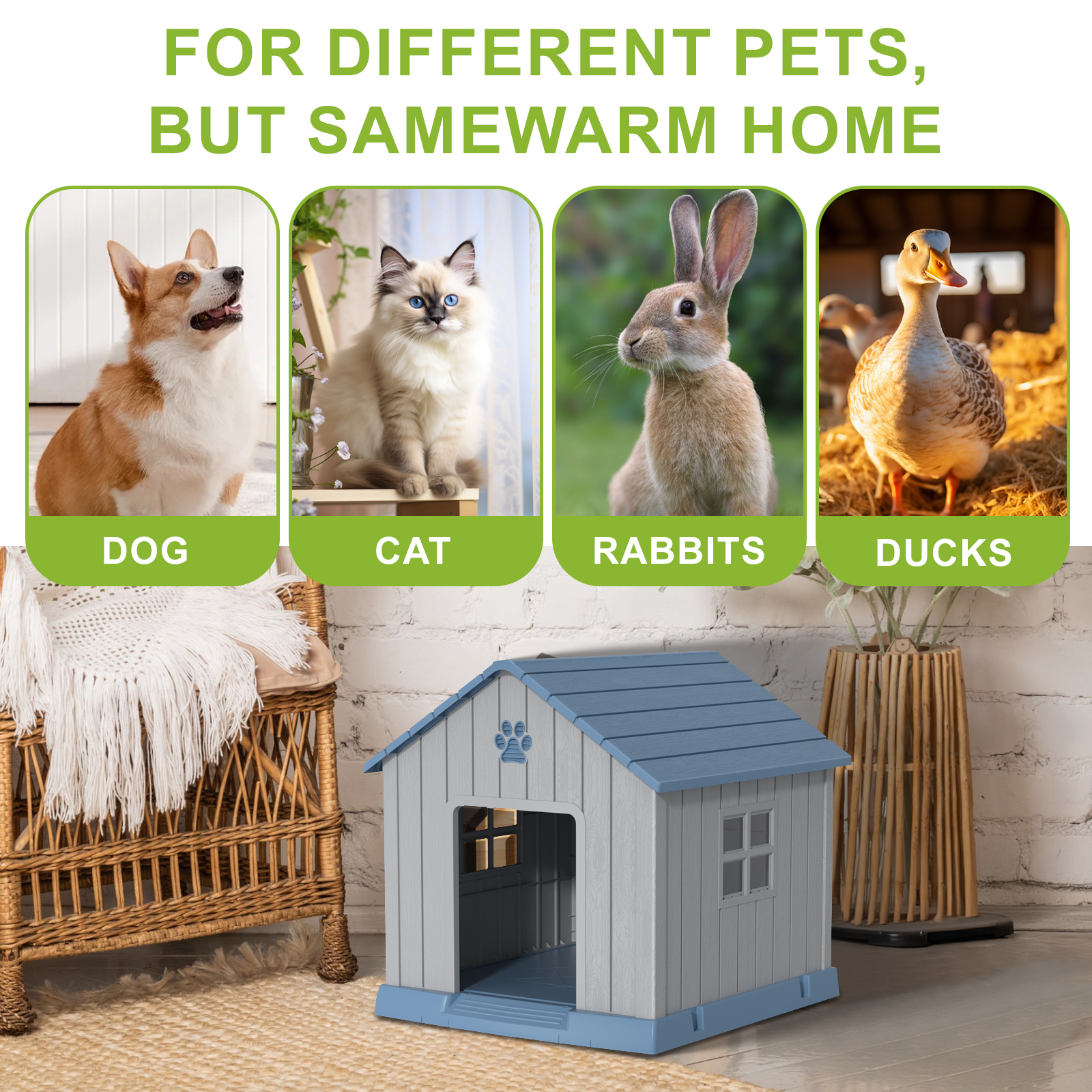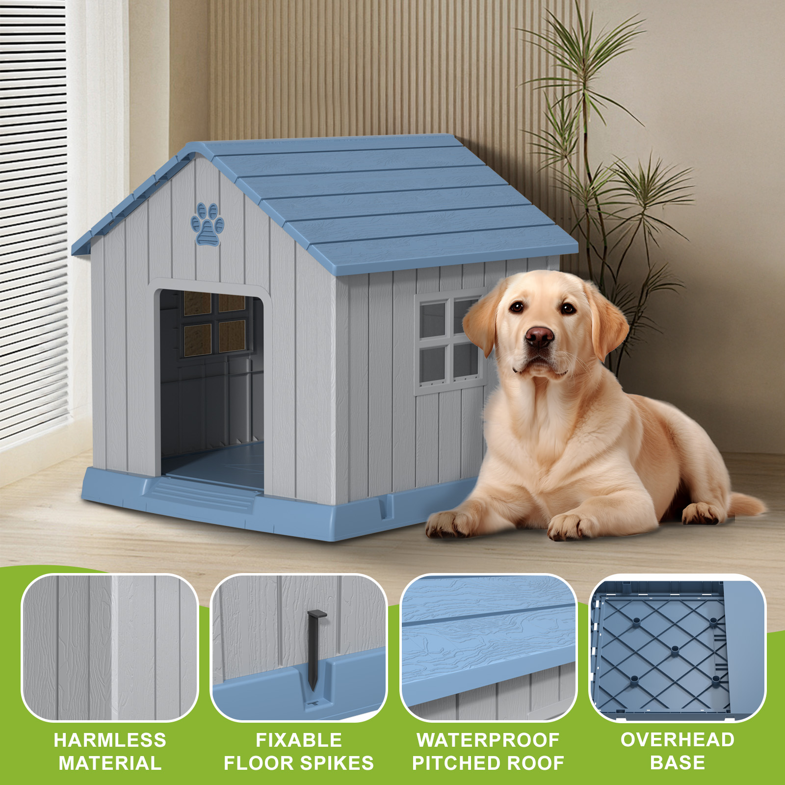 ENNSOO 31-Inch Plastic Outdoor Indoor Dog House with Waterproof, Elevated Floor & Air Vents, Blue Small: Ideal for Chihuahuas, Pugs, and small breeds (up to 25 lbs) Medium: Perfect for Labradors, Bulldogs, and medium breeds (up to 60 lbs)Both sizes provide ample space for stretching and lounging, ensuring your dog enjoys a cozy retreat tailored to their needs. Crafted from durable polypropylene, this dog house offers superior waterproof and UV-resistant protection for your furry companion. With a simple 20-minute assembly and a smooth, easy-to-clean surface, it provides a cozy and comfortable retreat tailored to your dog’s needs. The ventilated air vents and elevated floor ensure year-round climate control, keeping your pet cool in summer and warm in winter. Available in two sizes to accommodate small and medium breeds, this affordable and functional dog house is the perfect outdoor shelter for any climate.