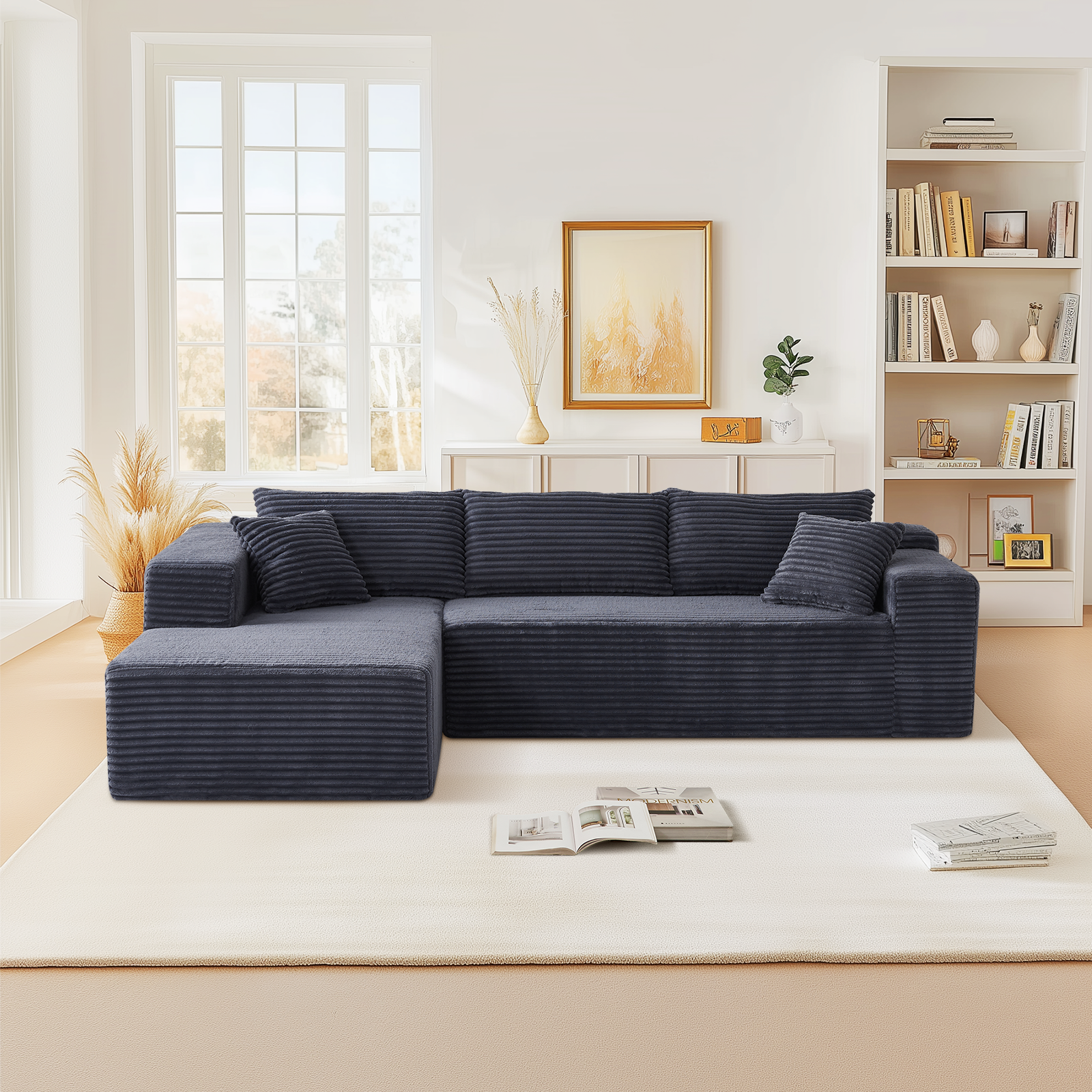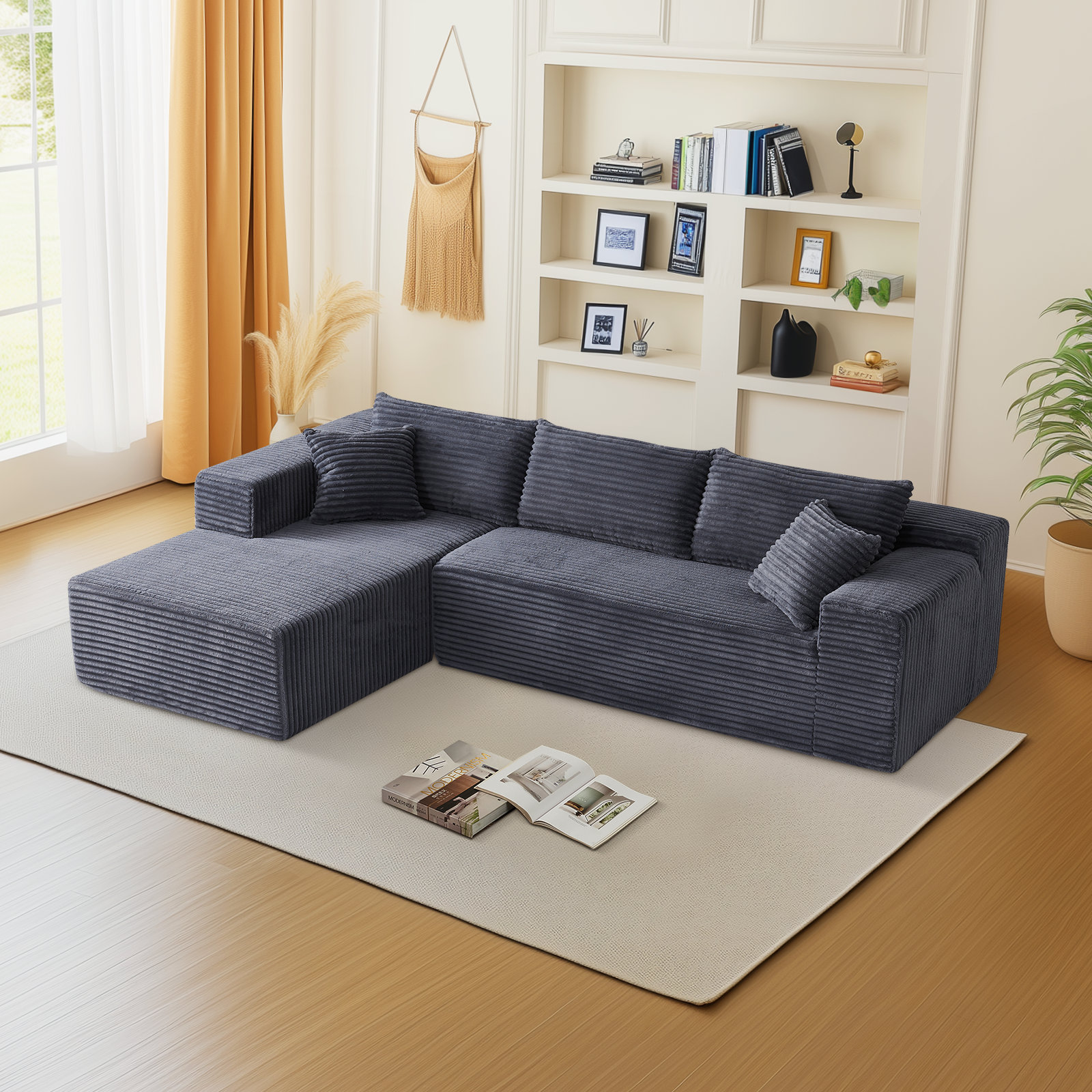 Comfort Accessories for Ultimate Relaxation:Our sectional couch comes complete with three plush back cushions and two decorative throw pillows. These aren’t just ordinary pillows – they’re movable, allowing you to arrange them according to your personal preference and create a cozy nook that’s uniquely yours. Whether you’re curling up with a good book or having a movie night with friends, these accessories enhance both the comfort and the visual charm of the couch.