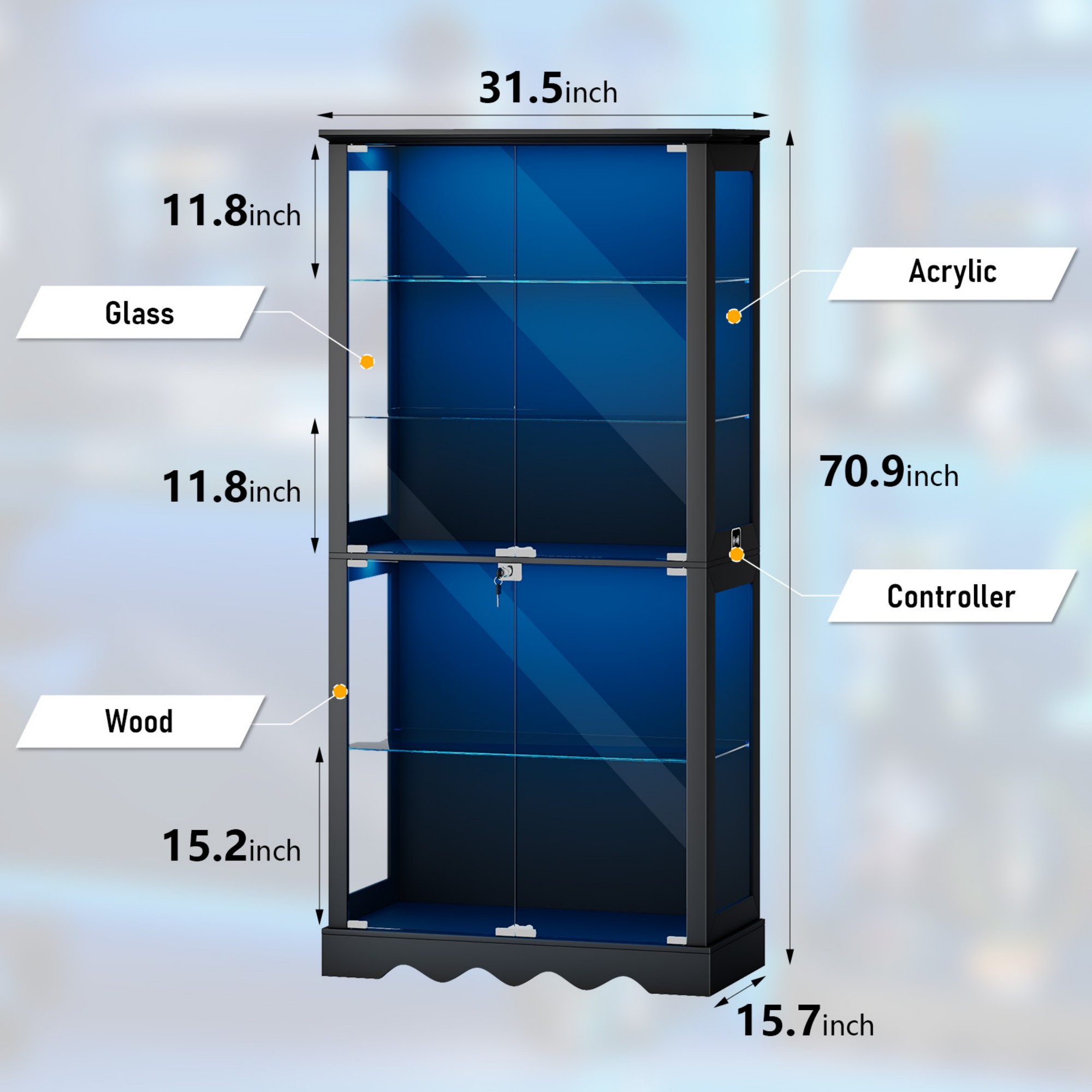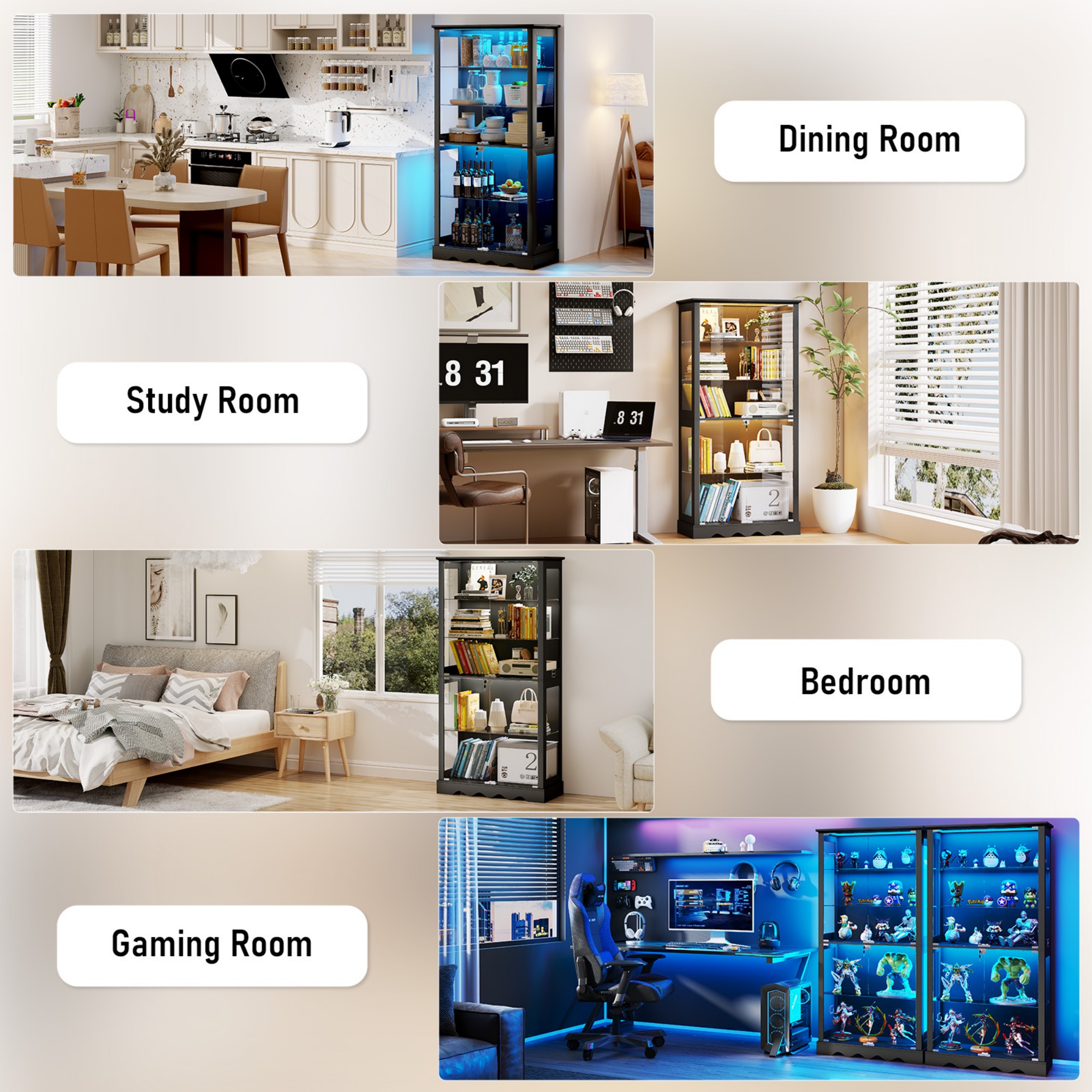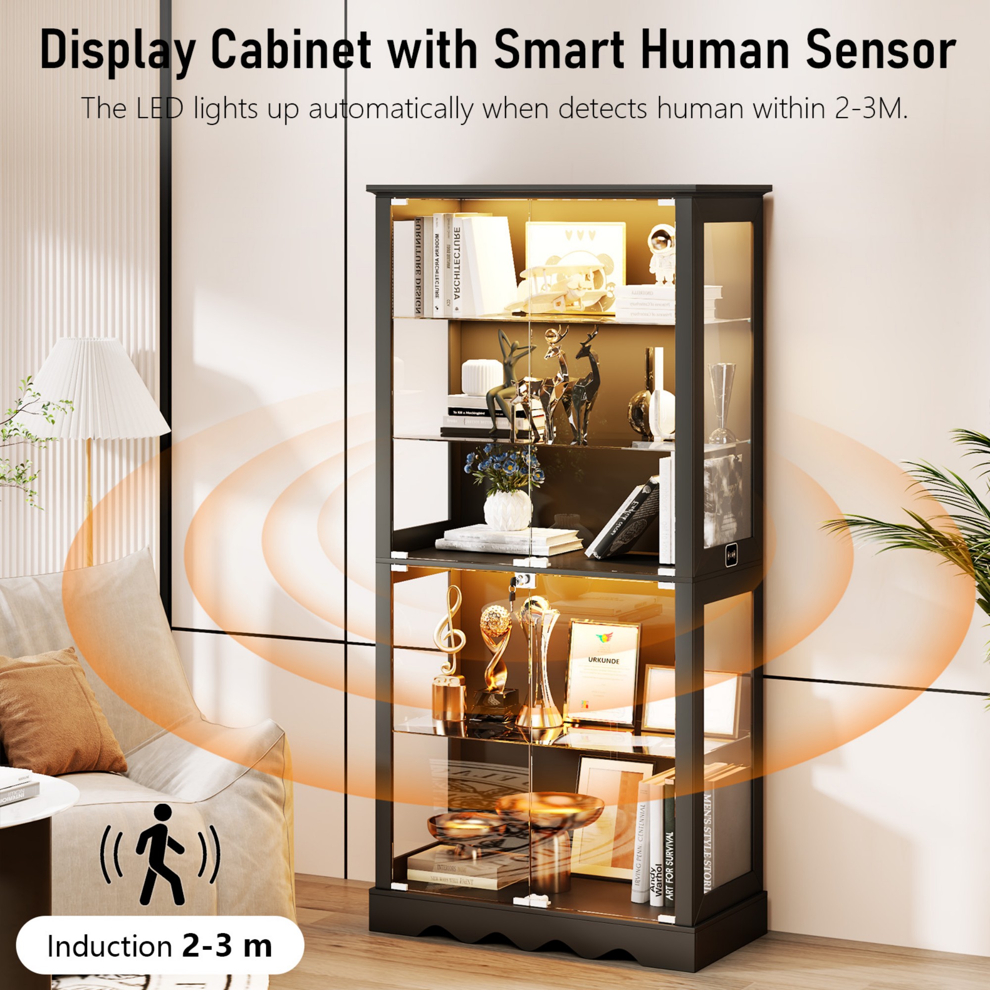 This glass display cabinet features a secure built-in locking system to safely store valuables, collectibles and delicate items, ideal for homes with children or pets. It offers a spacious 5-shelf design with generous storage space for collectibles, books and decorations. Structured with reasonable design, complete accessories and clear instructions, the cabinet ensures simplified and hassle-free assembly.
