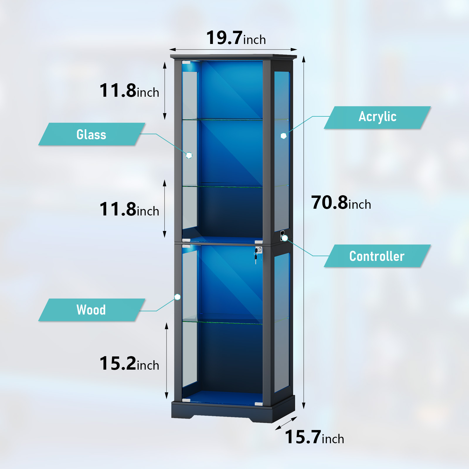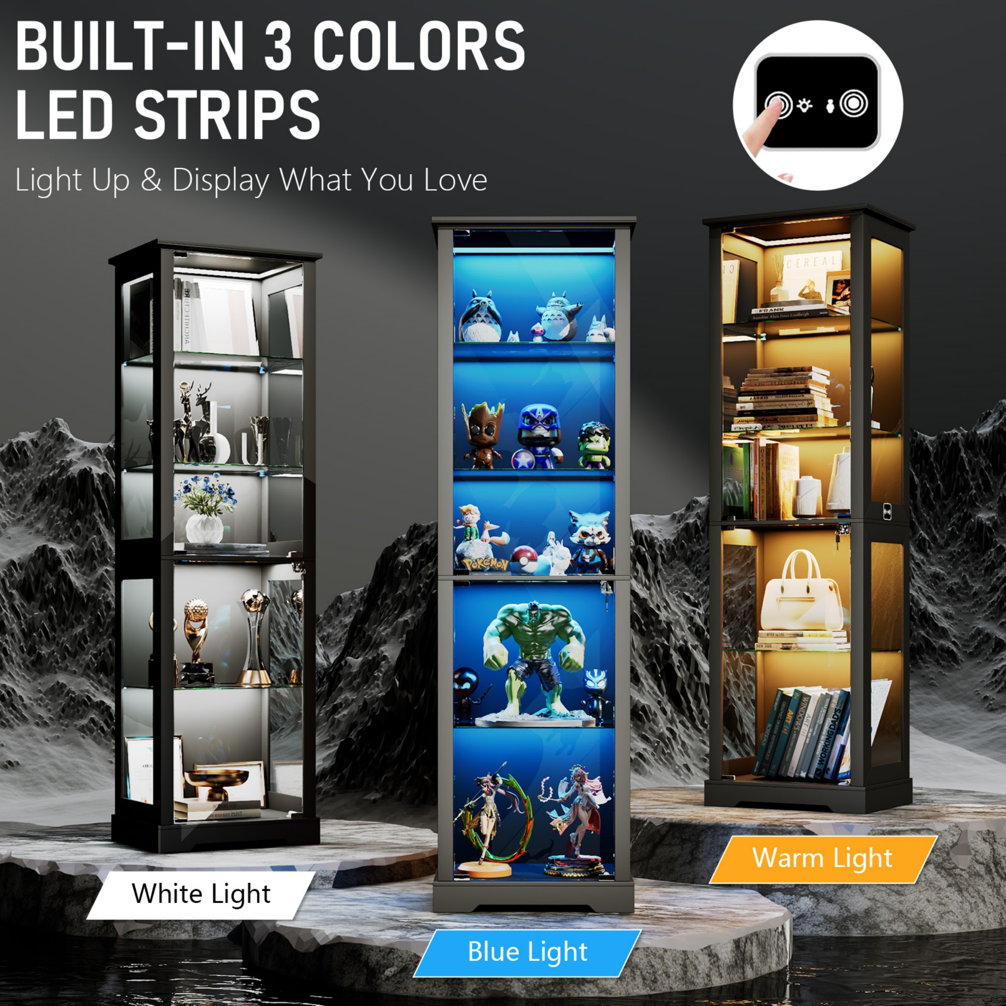TOPCOMFY 70.8″ Display Cabinet with Glass Doors, 5-Tier Curio Cabinet with 3 Color Lights for Collectibles, Glass Display Case with Lock, Storage Cabinets