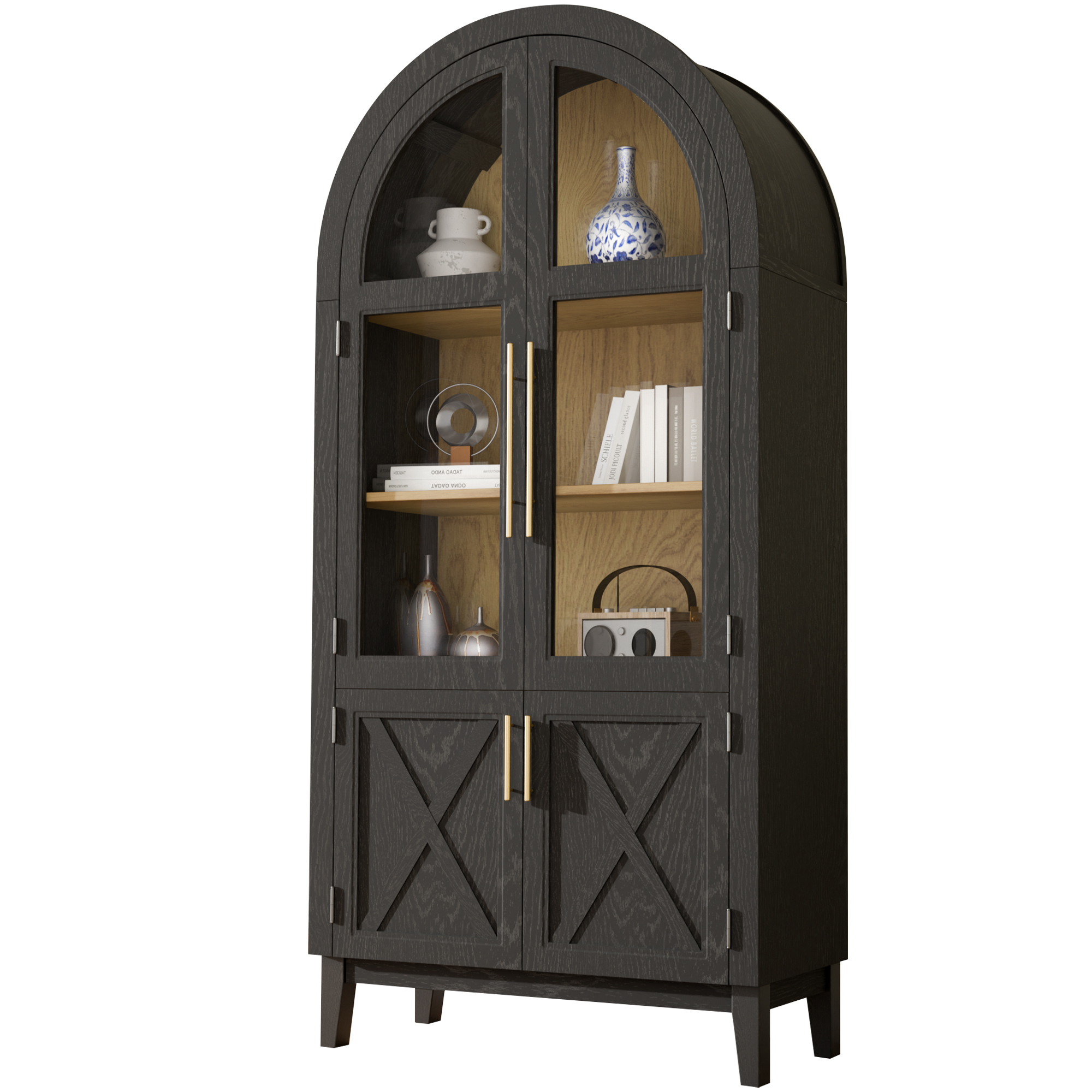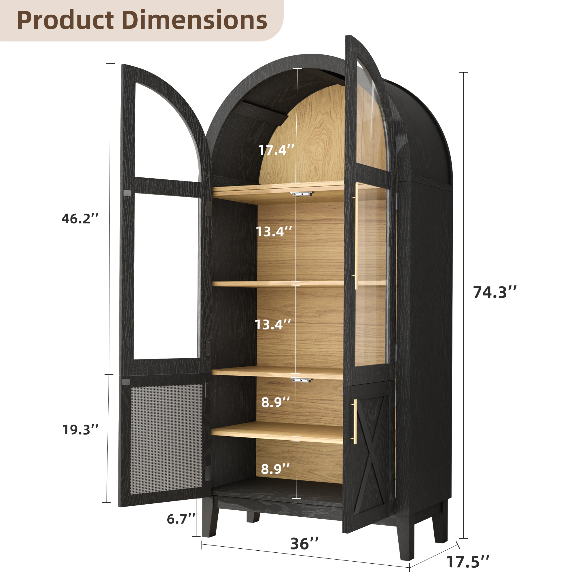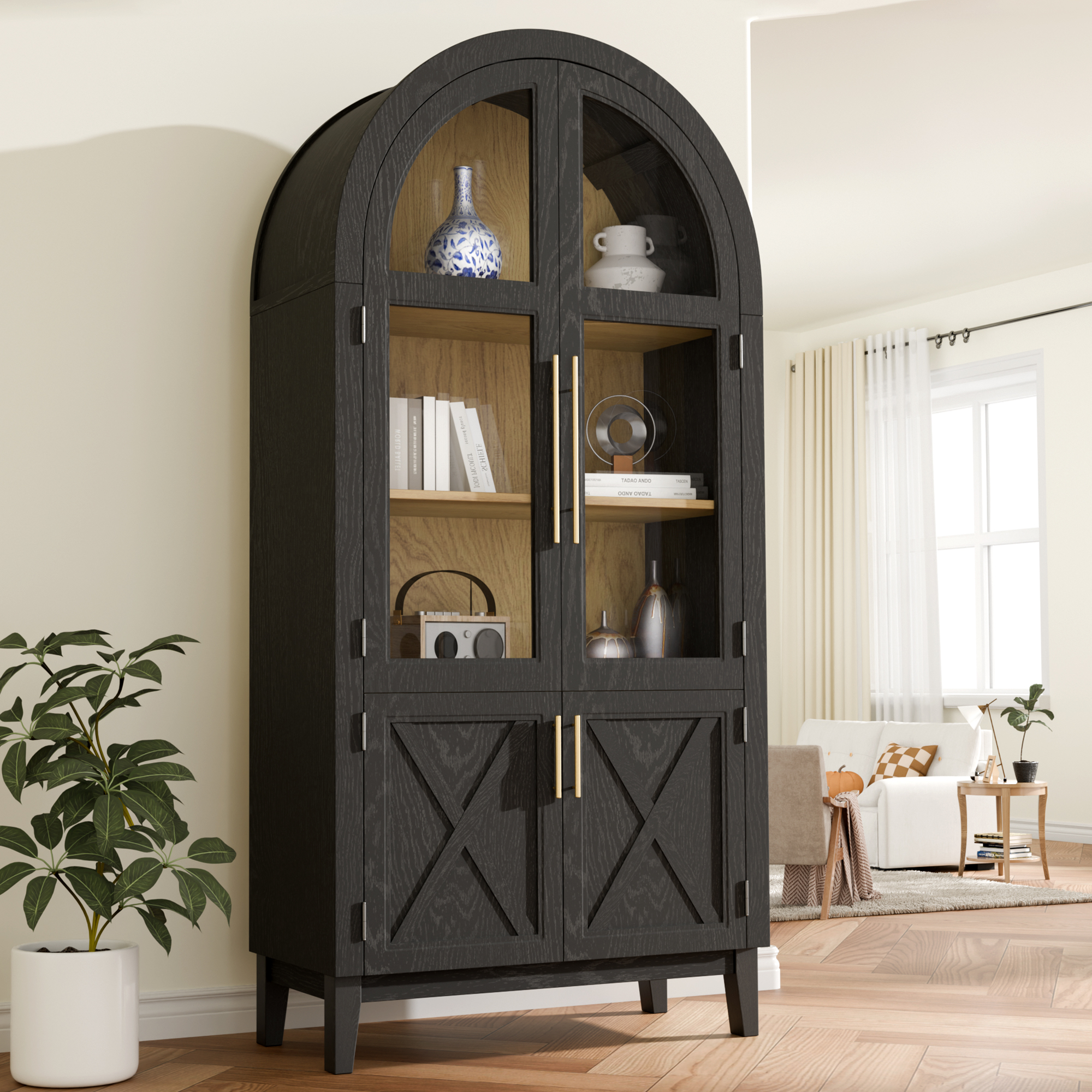TOPCOMFY 75″ Arched Cabinet with Glass Doors, Kitchen Storage Cabinet with Door, 5-Tier Arched Bookcase with Adjustable Shelves – Black&Natural