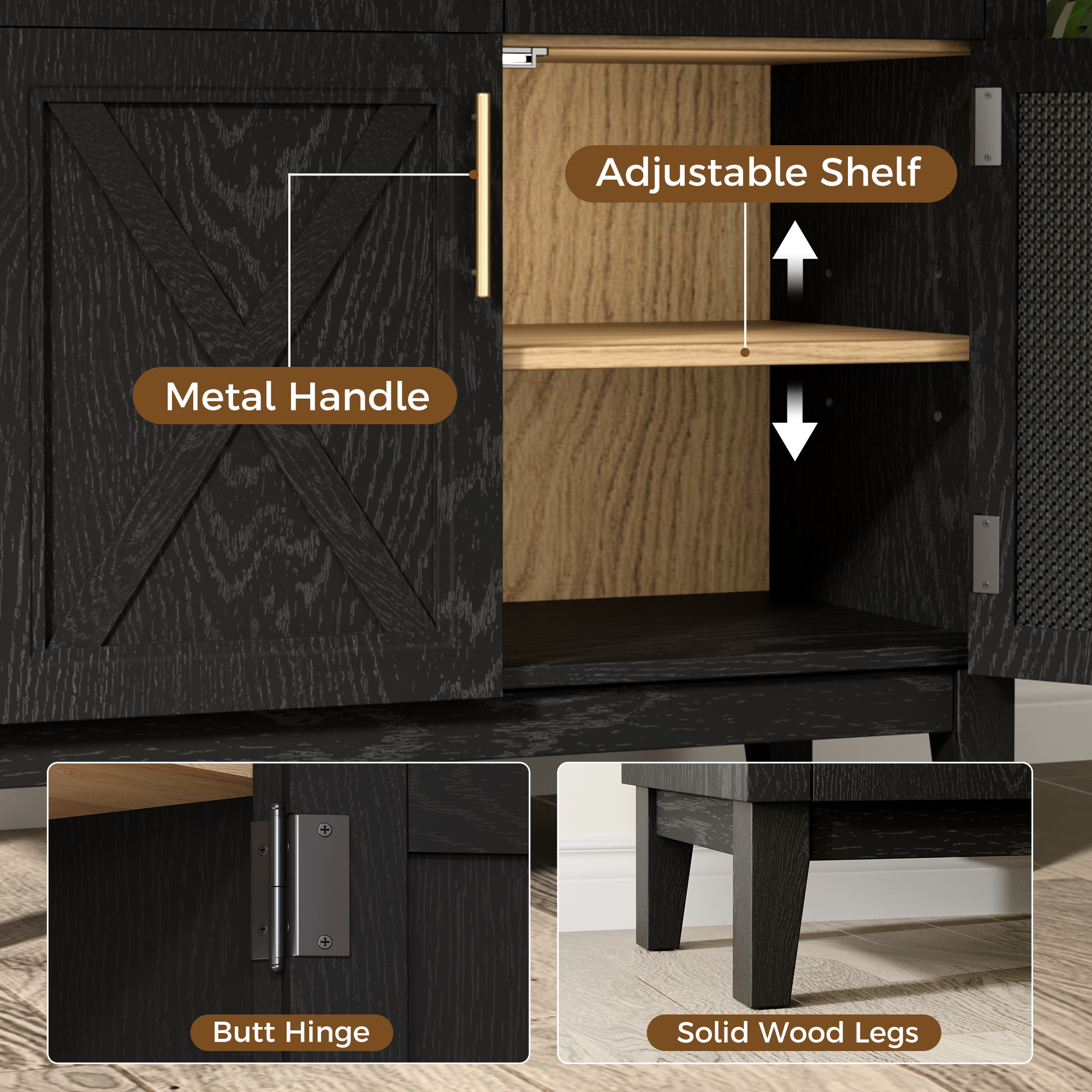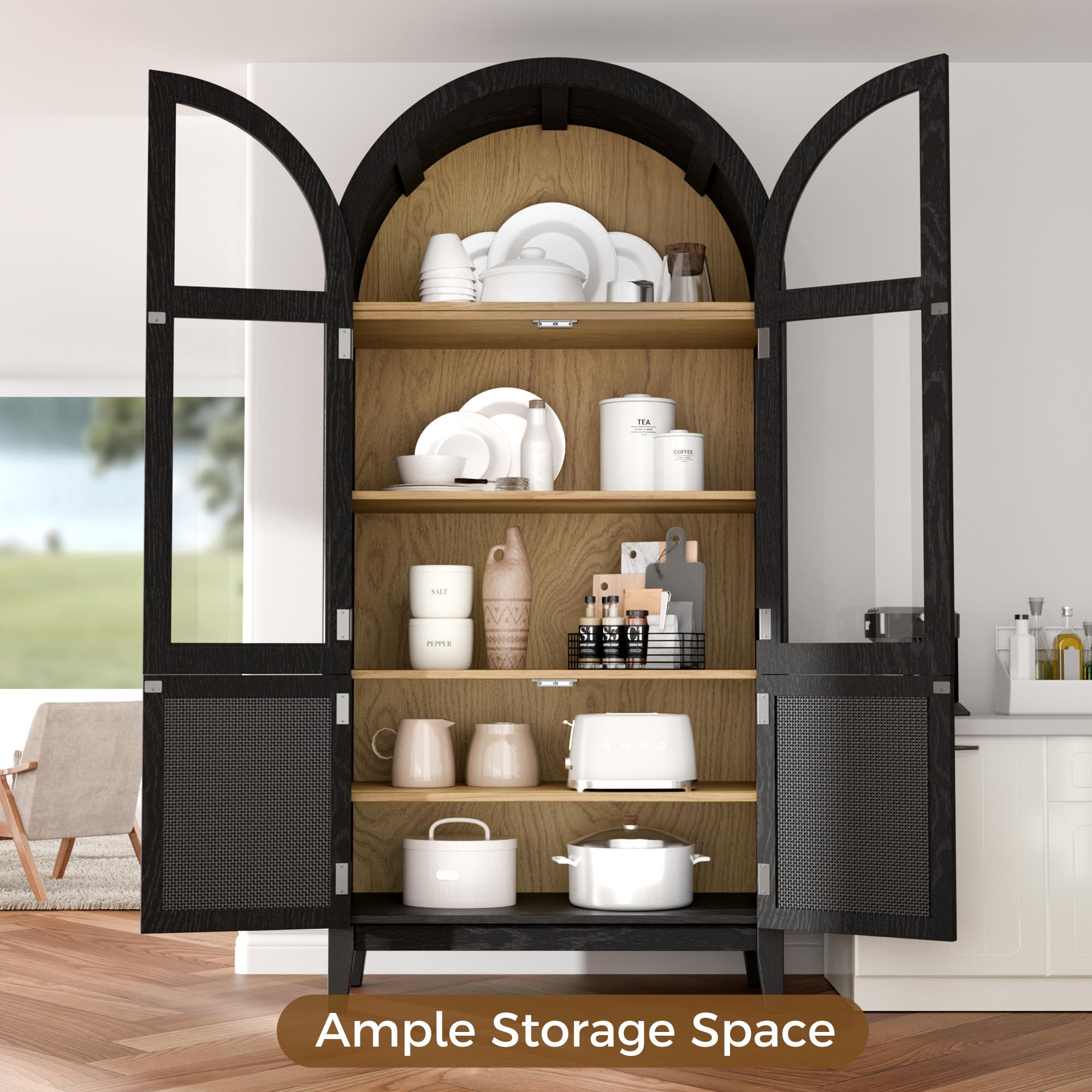 This kitchen pantry cabinet comes with 5-tier adjustable shelves, including three open display shelves and two inner adjustable shelves, providing ample storage for kitchen supplies, books, decorations and more to keep your space organized. It boasts an elegant arched top design with glass doors, adding timeless charm while protecting contents from dust. This versatile cabinet can serve as a pantry, storage cabinet, display cabinet or bookshelf, suitable for kitchens, living rooms and home offices. With complete accessories and clear instructions, assembly is simple and hassle-free.