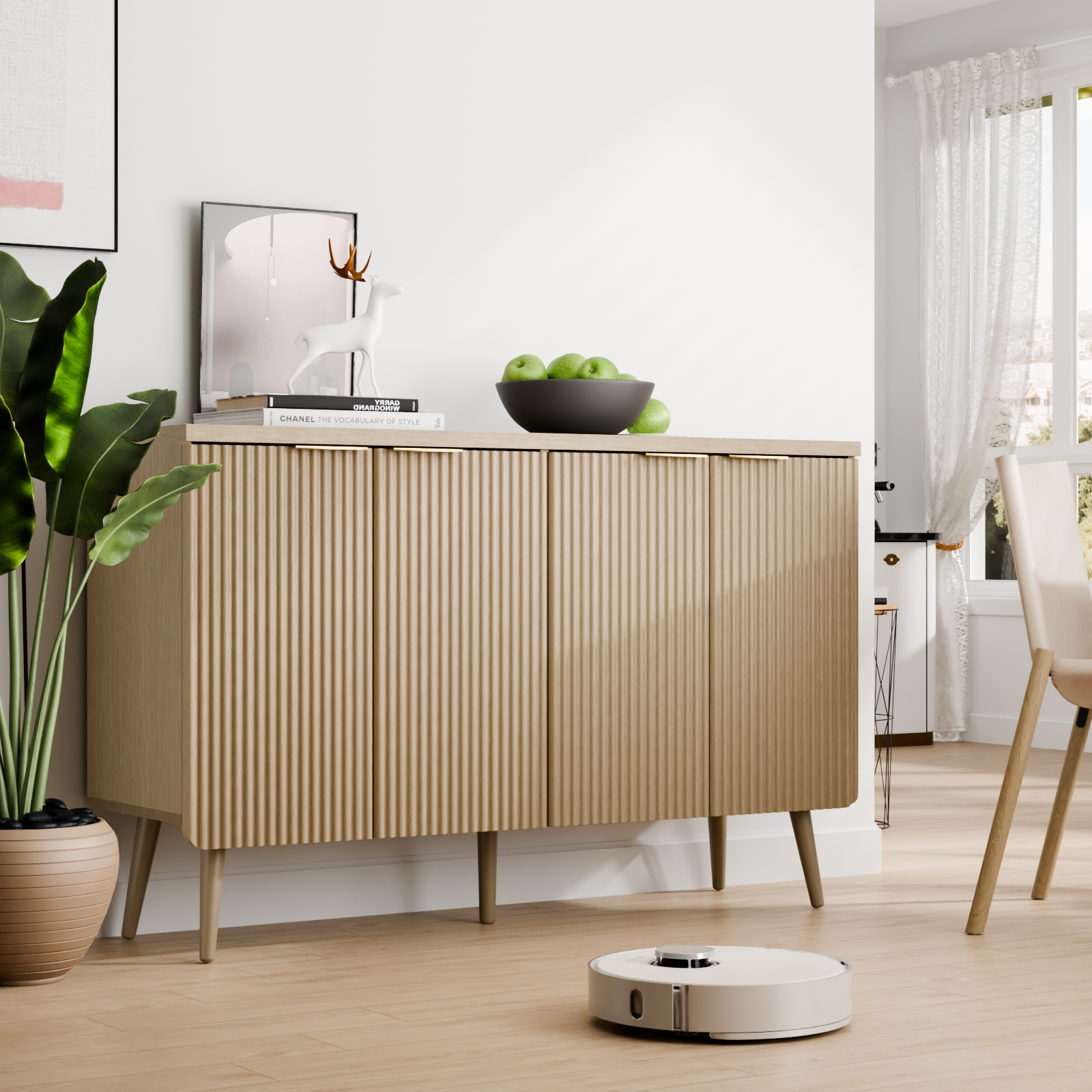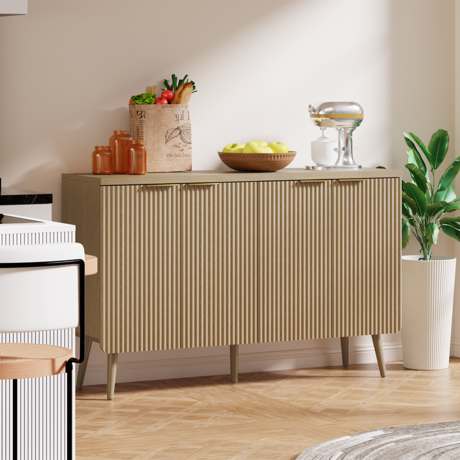 The cabinet features a stylish design with rounded corners and a striped pattern, presenting a modern and elegant look that is a great addition to any room. It has ample storage with four doors, providing generous space to organize items and keep the area tidy. Constructed from high – quality MDF materials, it is durable and can withstand daily use while maintaining its beauty. It is versatile and suitable for living rooms, bedrooms, or offices to adapt to different decor needs.